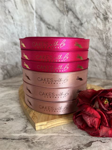 Fita de cetim personalizada | Fitas de cetim , Fitas personalizadas , Artes e artesanato. Fita de cetim personalizada - Hot stamping. Şunları içerebilir: a person holding up a pink ribbon with gold writing on the side and two fingers.