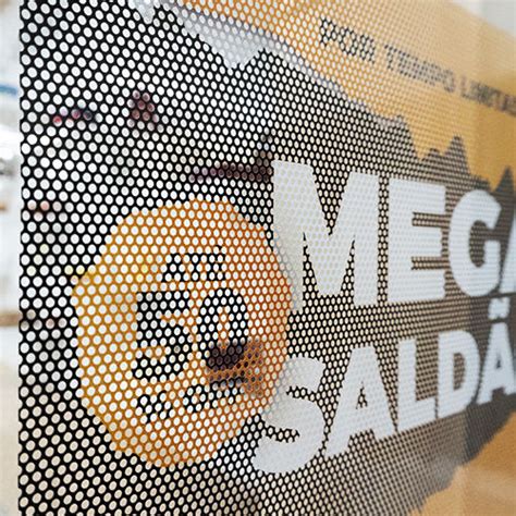 Adesivo Perfurado para Vidro. Material. Vinil Perfurado 120g.O adesivo em vinil perfurado é um material que imprime imagens em alta qualidade e, ao mesmo tempo, permite a visibilidade do lado de fora do vidro.